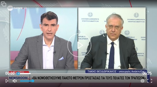 Μπαίνει τέλος στα ψιλά γράμματα των τραπεζών, είπε, μιλώντας στο ΕΡΤnews, o υπουργός Ανάπτυξης Τάκης Θεοδωρικάκος. διασαφηνίζοντας ότι εντός Μαΐου ξεκινά η διαβούλευση για το νομοσχέδιο προστασίας των δανειοληπτών.