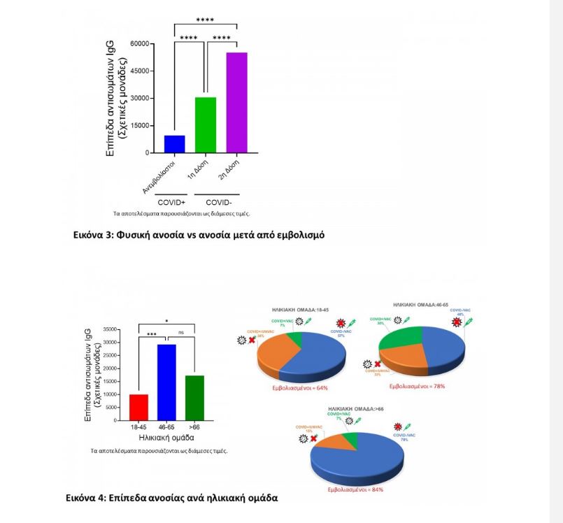 Τα αποτελέσματα αναδεικνύουν μια σημαντική διαφορά στα επίπεδα αντισωμάτων που επιτυγχάνονται μεταξύ φυσικής νόσησης και εμβολιασμού. Ο εμβολιασμός με οποιοδήποτε από τα εγκεκριμένα εμβόλια στην Κύπρο οδηγεί στην παραγωγή σημαντικά υψηλότερων τιμών αντισωμάτων παρά από τη φυσική νόσηση και ενδεχομένως υψηλότερη χημική ανοσία (Εικόνα 2) σε όλες τις ηλικιακές ομάδες που μελετήθηκαν. Εξίσου σημαντική είναι και η παρατήρηση ότι ο εμβολιασμός μετά από νόσηση έχει ως αποτέλεσμα την παραγωγή εξαιρετικά υψηλών επιπέδων αντισωμάτων στα άτομα αυτά, γεγονός που καταδεικνύει τη σημασία του εμβολιασμού ακόμα και ατόμων που έχουν νοσήσει στο παρελθόν (Εικόνα 2).