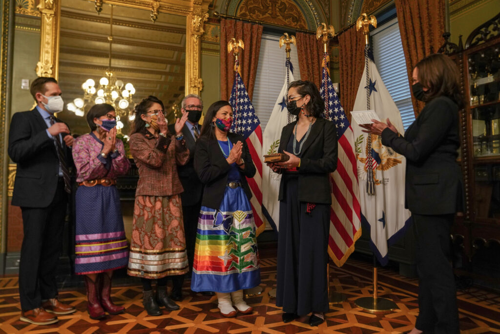 H Ντεπ Χάαλαντ είναι από χθες και επίσημα η πρώτη ιθαγενής σε υπουργική θέση στις ΗΠΑ. Στην ορκωμοσία της για την θέση της Υπουργού εσωτερικών, την οποία τέλεσε η Αντιπρόεδρος των ΗΠΑ Κάμαλα Χάρις, η κυρία Χάαλαντ πήγε ντυμένη με παραδοσιακή χρωματιστή φορεσιά τιμώντας τη φυλή της, Λαγκούνα Πουέμπλο, που ζει εδω και 35 γενιές στο Νέο Μεξικό.
