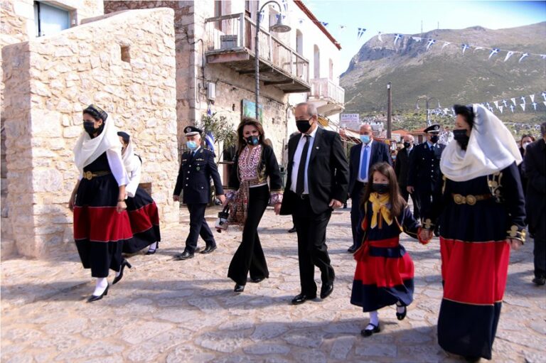 Την ίδια στιγμή στην Πελοπόνησσο, η κυρία Γιάννα Αγγελοπούλου-Δασκαλάκη, Πρόεδρος της Επιτροπής “Ελλάδα 2021”, πήρε μέρος σε εορταστικές εκδηλώσεις για την επέτειο του 1821, φορώντας κομμάτια τοπικής φορεσιάς, για να τιμήσει την συμβολή των Μανιατών στον Αγώνα για την Ελευθερία. Ηταν ένα μαύρο με χρυσό γιλέκο και ζώνη με κεντημένα μοτίβα και κρόσια από το Εθνογραφικό και Λαογραφικό Μουσείο Χρισσού και ένα πουκάμισο φτιαγμένο σε εργαστήριο ελληνικής παραδοσιακής φορεσιάς στον Πύργο Ηλείας. Στο χέρι της κρατούσε όχι μία από τις αναρίθμητες designer bags ξένων οίκων της συλλογής της, αλλά το αφιερωμένο στα 200 χρόνια της Εθνικής μας επετείου πουγκί με αναφορές στην στολή του εύζωνα, της ελληνικής εταιρείας πολυτελών αξεσουάρ, Callista Crafts -ένα κλείσιμο ματιού στις φασιονίστες που θα καταλάβουν. Το κάτω μέρος συμπλήρωναν σύγχρονα στοιχεία: μαύρο παντελόνι, στη flare γραμμή που προτιμά πάντα, ψηλοτάκουνες μαύρες μπότες και τα χαρακτηριστικά της μεγάλα μαργαριταρένια σκουλαρίκια. Το σύνολο το υποστήριζε άψογα η πάντα γυμνασμένη και λεπτή σιλουέτα της κυρίας Α.