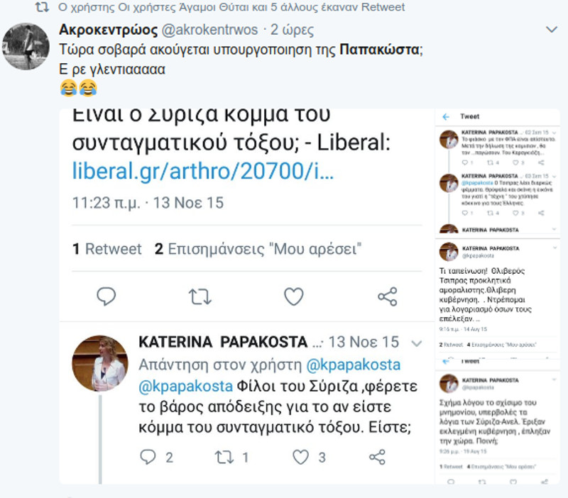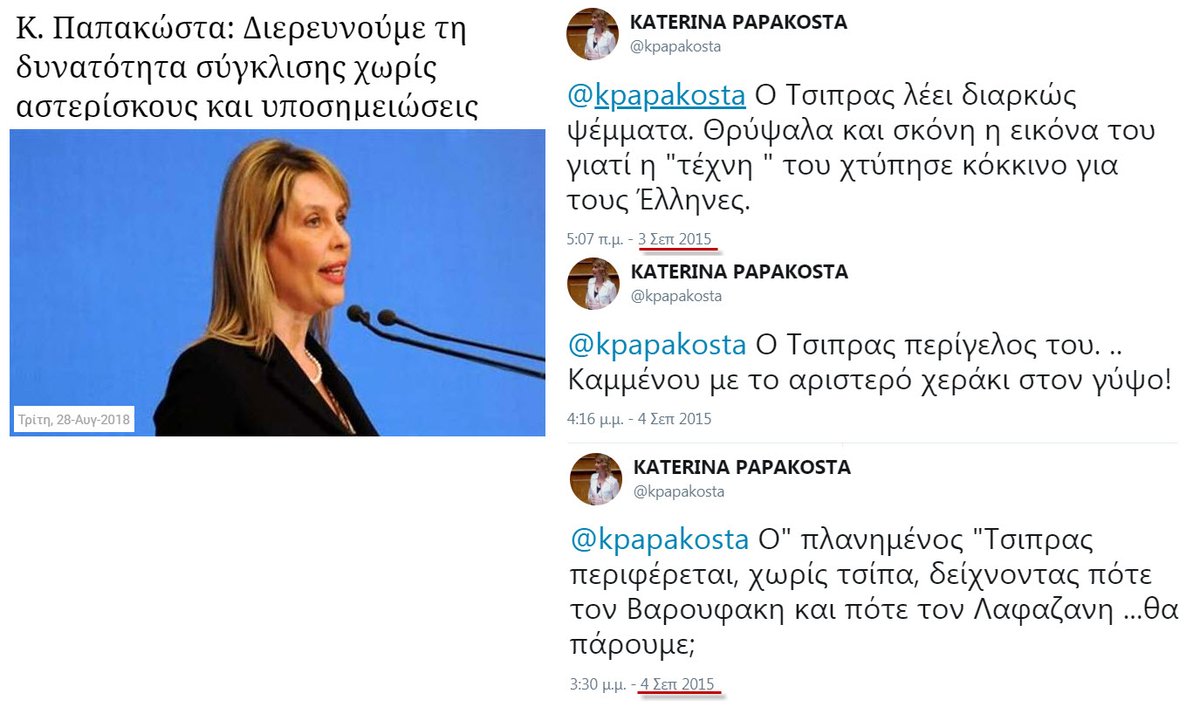 - Υπόψη ότι στο παρελθόν η «Αυγή», το «Left» και σύσσωμη η ΚΟ του ΣΥΡΙΖΑ κατηγορούσε την κ. Κατερίνα Παπακώστα, προσδίδοντάς της μάλιστα και φασιστική λογική, αφού είχε αναφέρει για τους μετανάστες ότι έρχονται στη χώρα μας σαν τις κατσαρίδες. Και τωρα προσβλέπουν στη στήριξή της