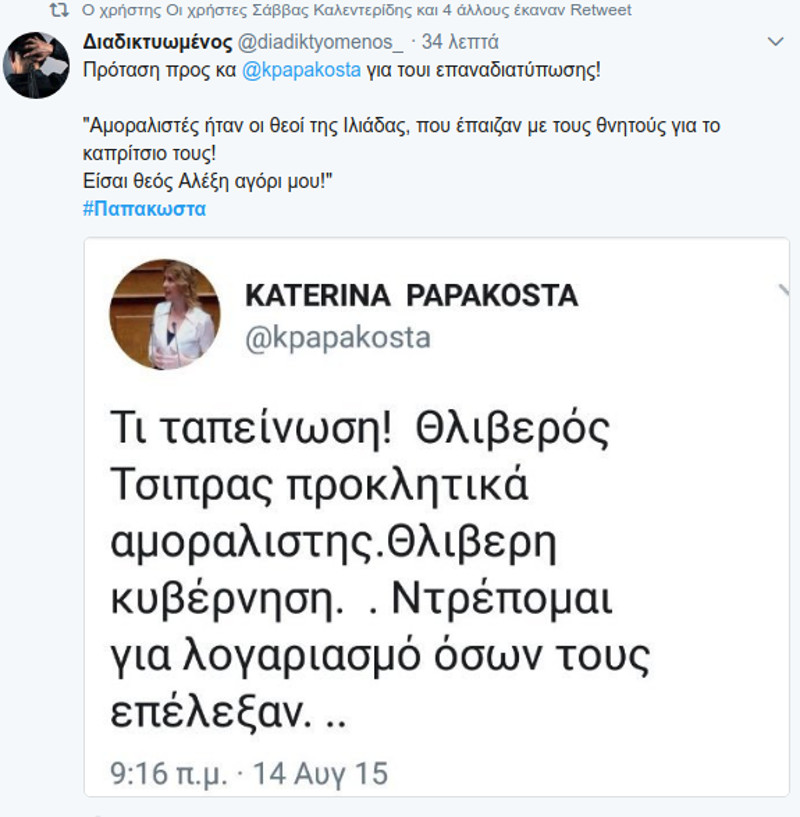 - Τι μας διδάσκει η Κατερίνα Παπακώστα; Ότι αν είσαι καραγραφική, μίρλα και τα βάλεις με τη ΝΔ, παίρνει υπουργείο στο ΣΥΡΙΖΑ. Εύγε.