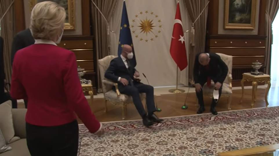 Και ενώ στην αρχή ο Τούρκος πρόεδρος εμφανίζεται να ετοιμάζεται να καθήσει χωρίς ωστόσο να έχει καρέκλα πίσω του, το πρόβλημα δεν είναι αυτό. Οι διαθέσιμες καρέκλες είναι μόλις δύο, με αποτέλεσμα η Ούρσουλα φον ντερ Λάιεν να σαστίζει προς στιγμήν αφού δεν έχει πού να καθήσει για να συνομιλήσει ως ίση προς ίσους.