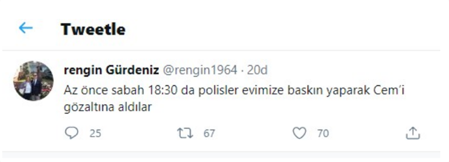 Την είδηση επιβεβαίωσε, με ανάρτηση στο twitter η σύζυγός του Ρενγκίν Γκιούρντενιζ η οποία ανέφερε ότι αστυνομικοί έκαναν έφοδο στην κατοικία τους λίγο πριν τις 6.30 πμ και συνέλαβαν το σύζυγό της.
