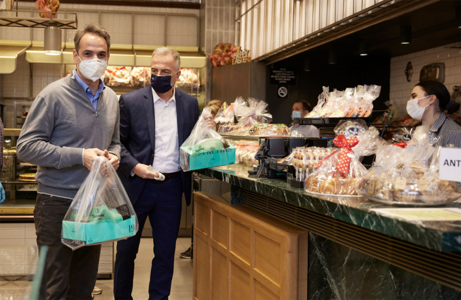 Ο Κυριάκος Μητσοτάκης ψωνίζει τσουρέκια για το Πάσχα στη Θεσσαλονίκη. “Ωραίος βγήκες παρά τη μάσκα!” είπε ο πρωθυπουργός σε έναν πολίτη με τον οποίο έβγαλε φωτογραφία έξω από το ζαχαροπλαστείο. Ο Κυριάκος Μητσοτάκης ψώνισε τσουρέκια παρέα με τον υφυπουργό Μακεδονίας-Θράκης, Σταύρο Καλαφάτη ενώ ρώτησε περαστικούς πολίτες αν έχουν κάνει το εμβόλιο για τον κορωνοϊό.